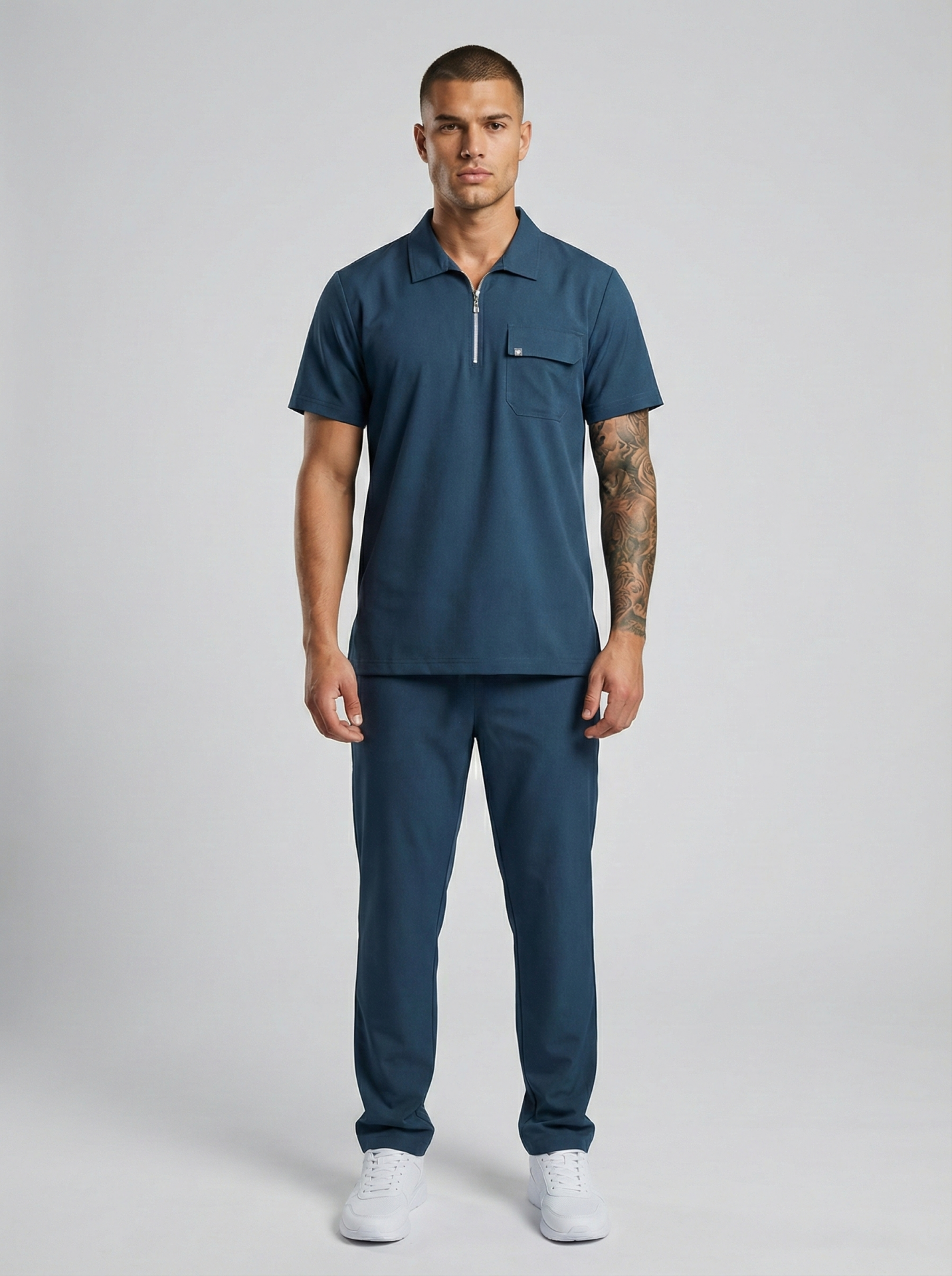 NERO-Petrol Mavisi Likralı Polo Yaka Erkek Takımı