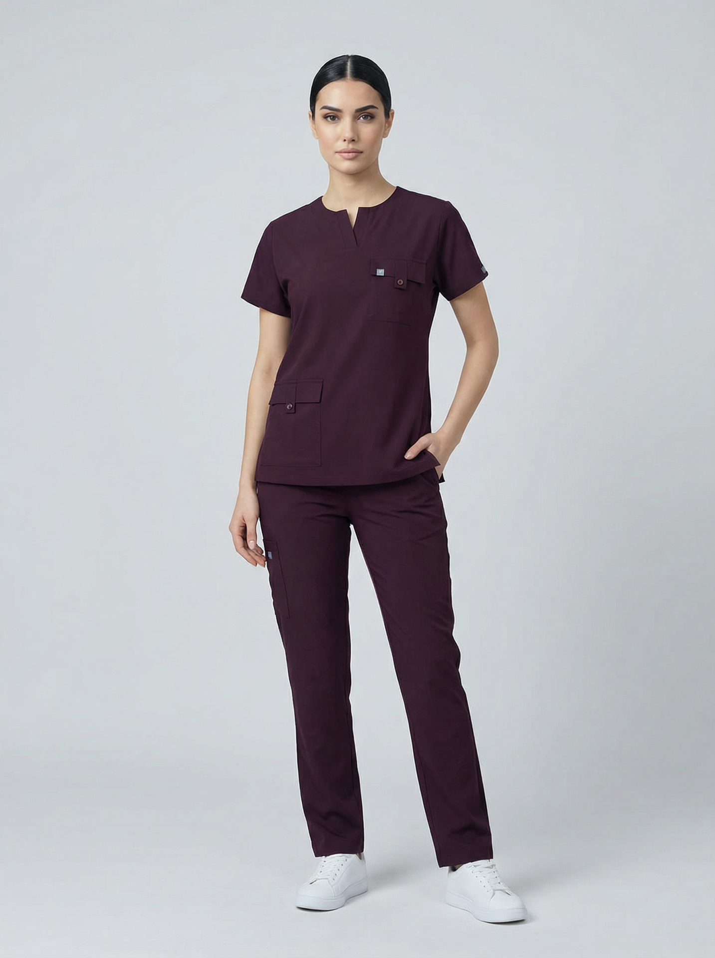 Asil mürdüm tonu, güçlü ve seçkin bir stil oluştururken; doktor, hemşire, diş hekimi, klinik personeli ve güzellik merkezi çalışanları için profesyonel bir alternatif sunar.